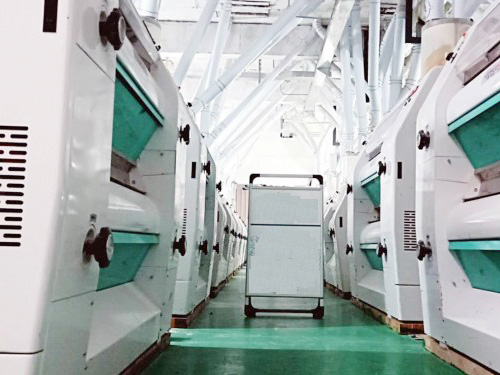 在倉儲、干法清理,制粉及面粉配粉的各道工序完全自動化,日加工小麥200噸的面粉加工生產線。